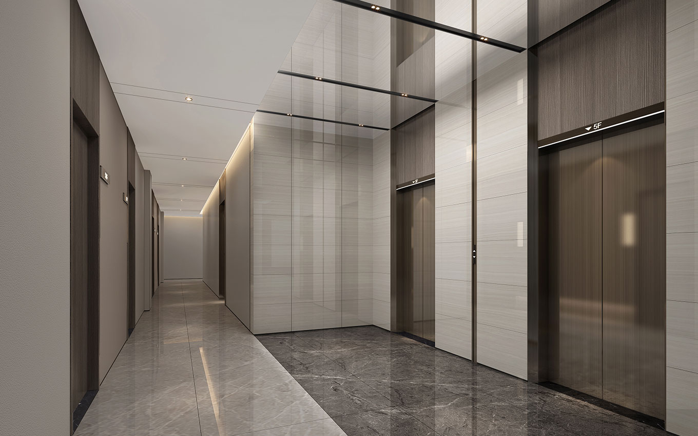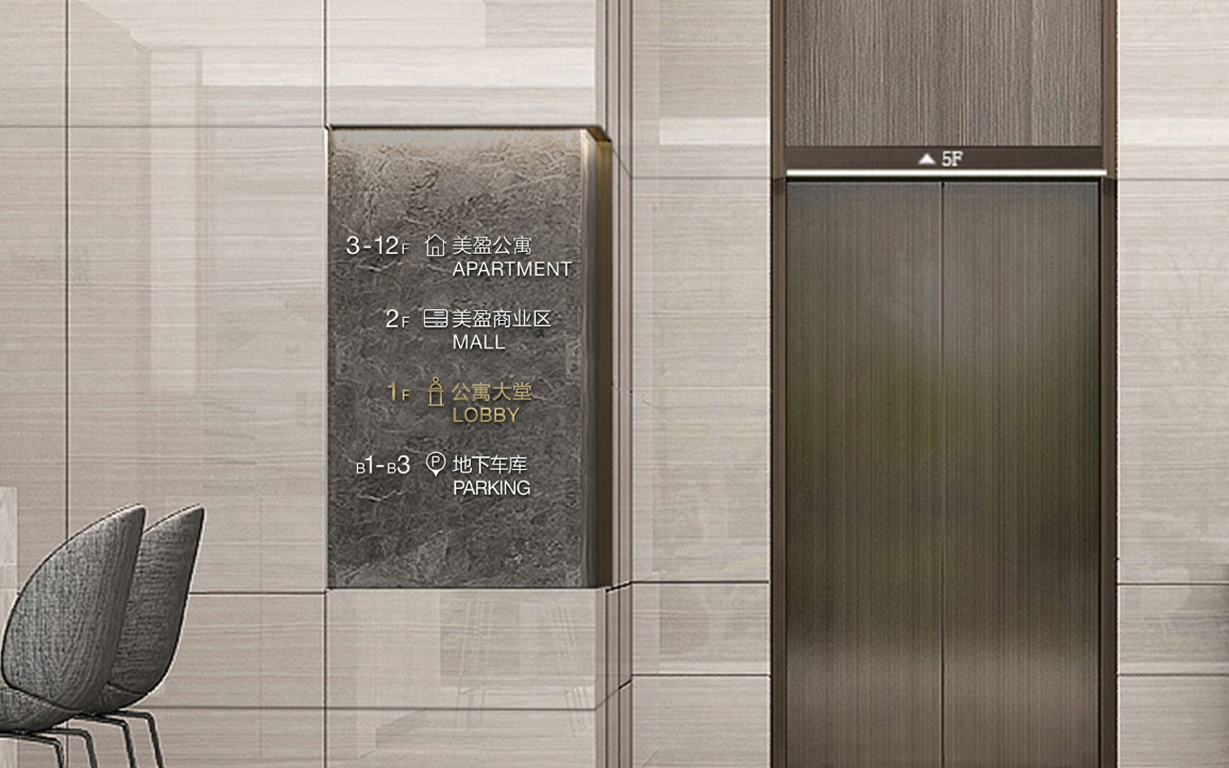 珠海电梯厅标识设计展现简洁的风格,品牌设计公司对美盈公寓标识导向系统设计结合了装修的风格。